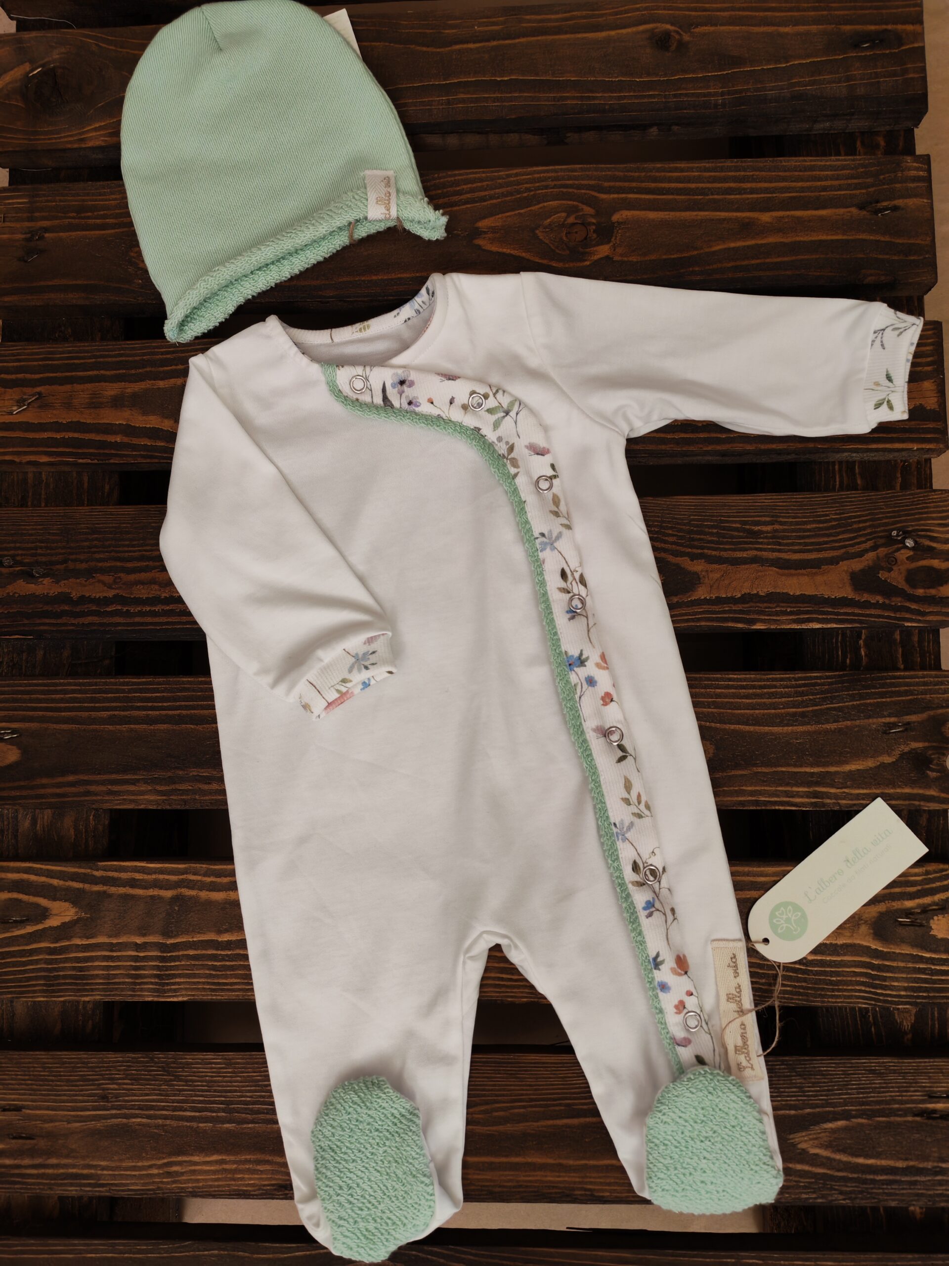 Questa tutina è un modello pensato per le bimbe realizzabile in varie taglie, comoda per il cambio pannolino perché completamente apribile sul davanti tramite clips.